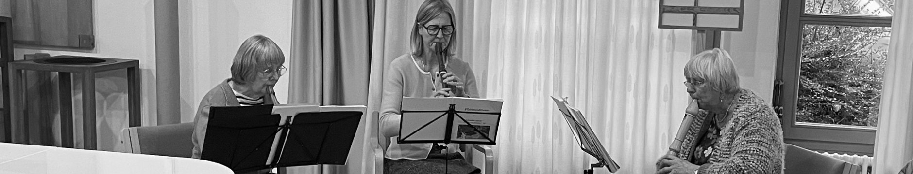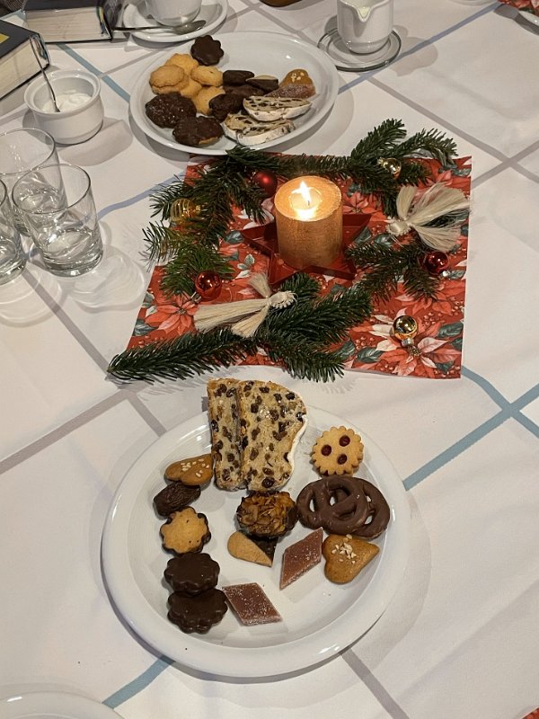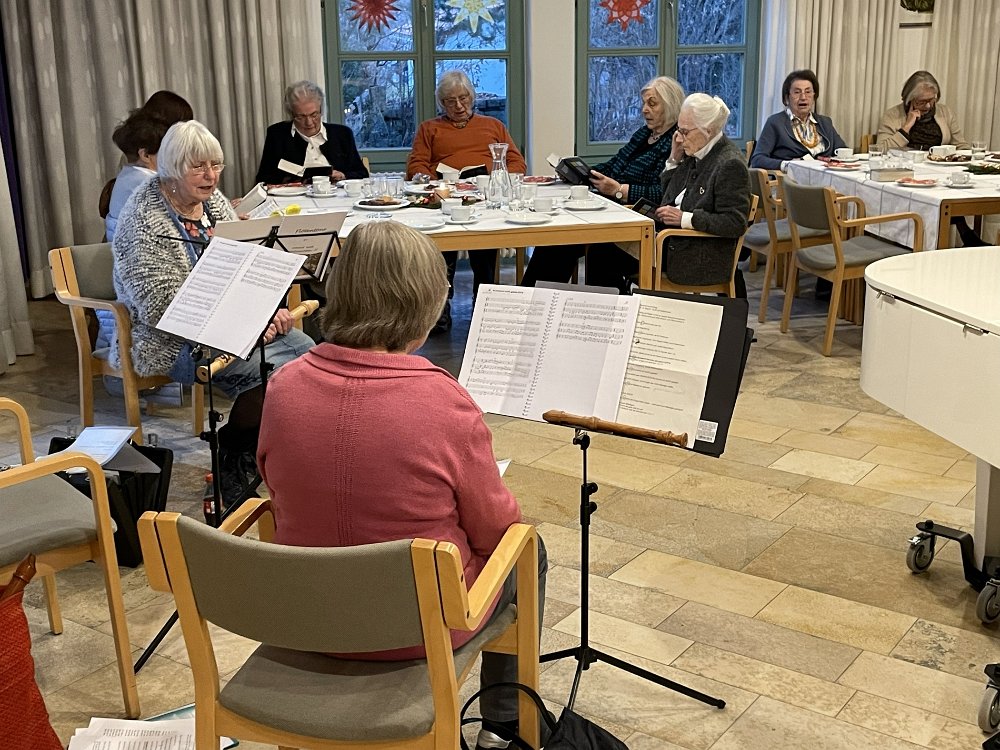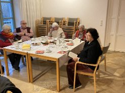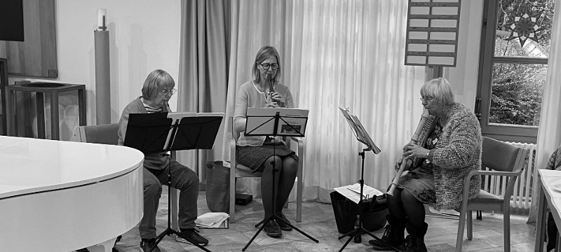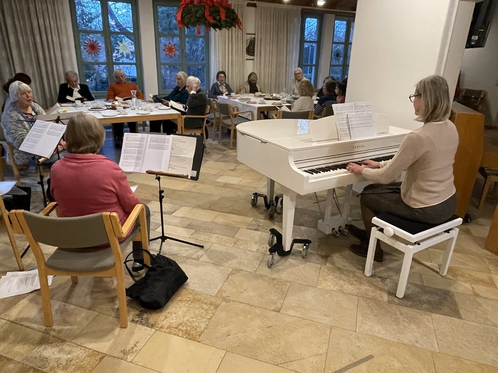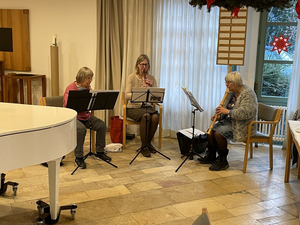 16.12.2025 - Beim Seniorennachmittag im Advent wurde viel musiziert: Mitglieder des Flötenensembles bliesen schöne Weisen und die Besucherinnen und Besucher sangen begeistert advent- und weihnachtliche Lieder unter Begleitung von Bettina Schickel auf dem neuen weißen elektronischen Flügel. Zum obligaten Kaffee zu Beginn des Nachmittags gab es jahreszeitgemäß Weihnachtsstollen und -plätzchen. Fotos: Klaus Hendel